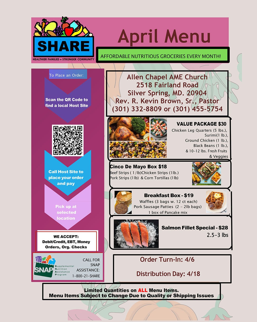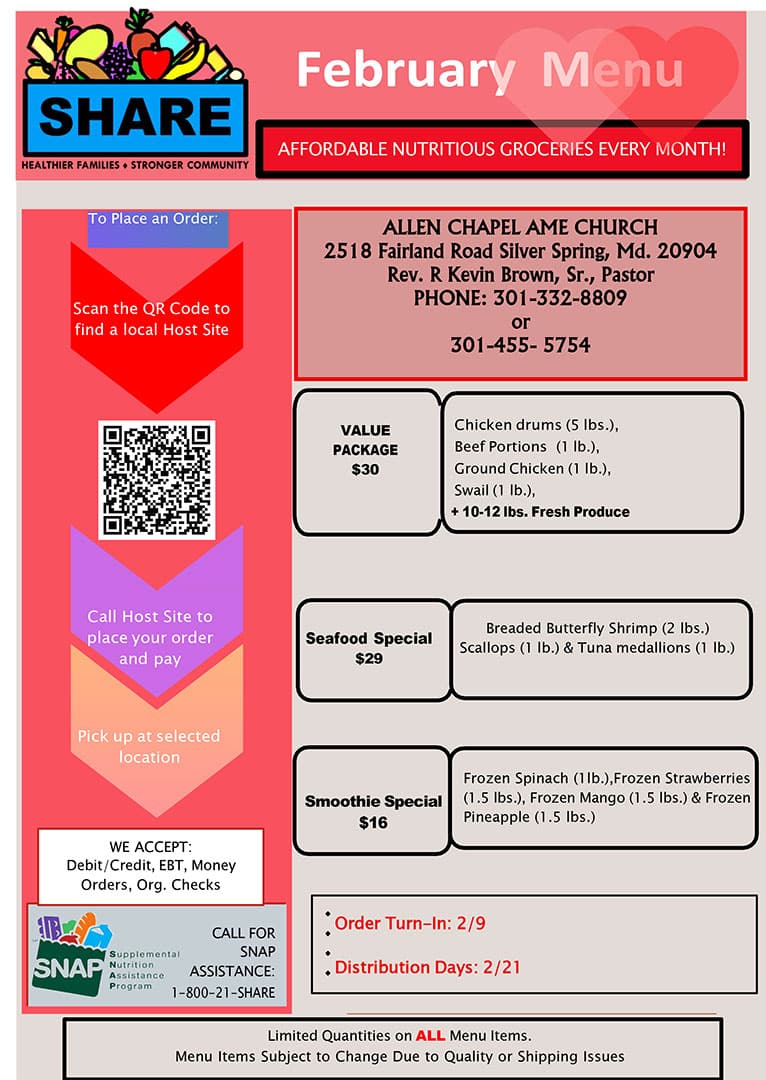 Food orders are picked up at the host site location on a day designated by the site host; Allen Chapel AME, Silver Spring MD. Food packages cannot be delivered to a consumer’s home.